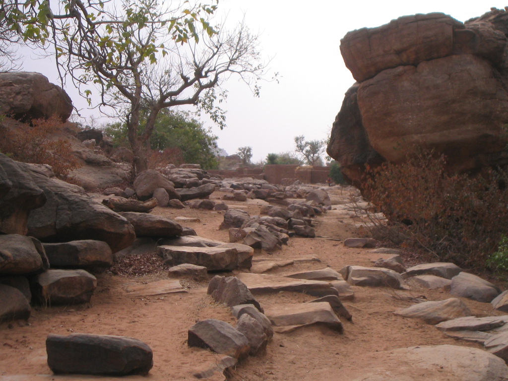 Pays Dogon _ Trou genre dolmen, sentier bordé de pierre, et femmes