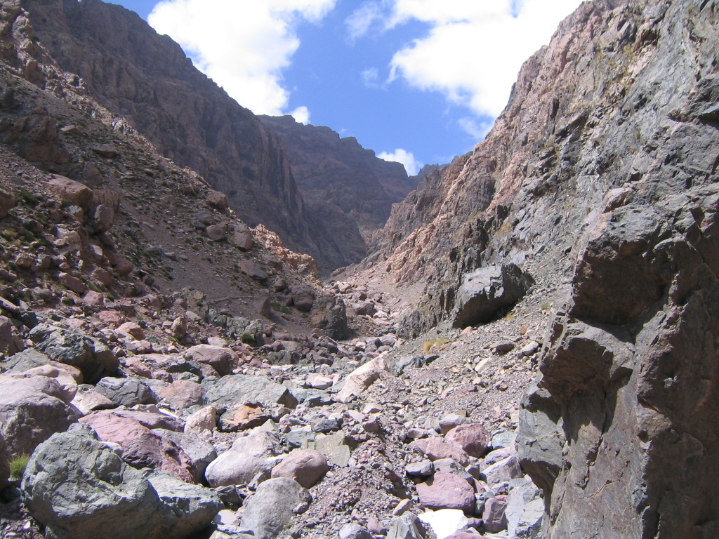 Haut Atlas _ Vue vers le haut, le trou au fond en haut, c'est le col de Tizi N'Ouanoums